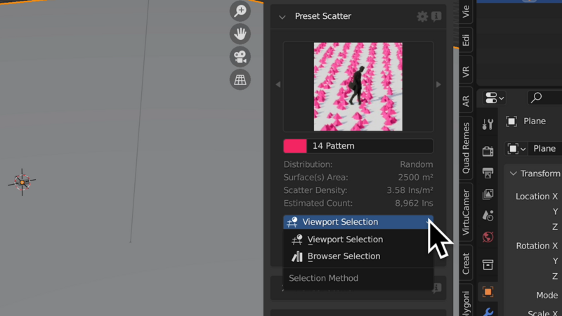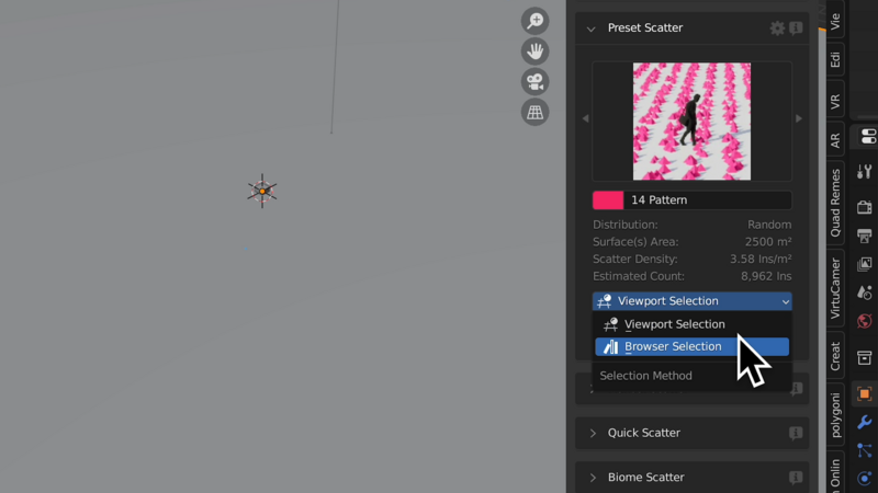 ビューポートのオブジェクトを散布するのか(Viewport Selection)、アセットブラウザーのオブジェクトを散布するのか(Browser Selection)、どちらかを選択します。