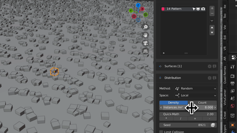 すると、ベースのオブジェクト(平面データ)の表面に、選択したオブジェクト(立方体)が散布されます。