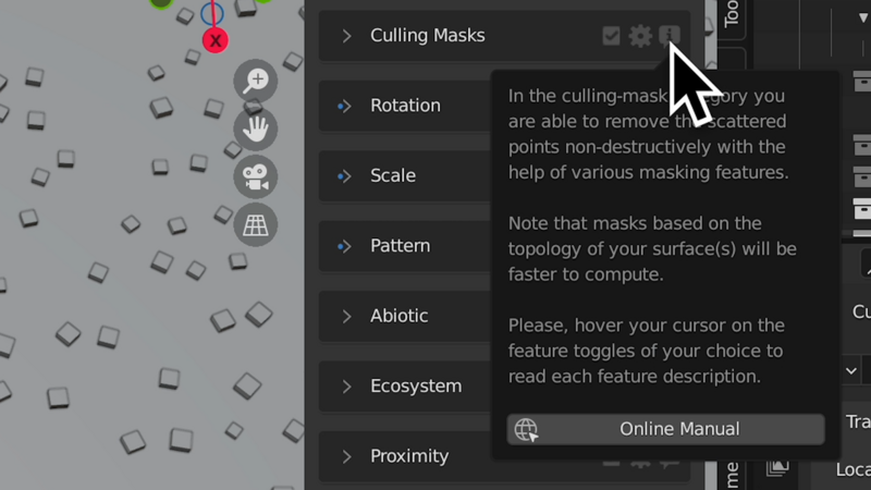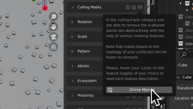 Geo-Scatterのパネルには、各項目の右側に「i」マークがついています。